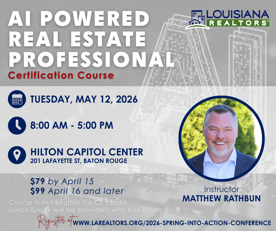 Louisiana REALTORS® is excited to host our annual legislative conference in Baton Rouge on May 13-14, 2026. This is a great opportunity to learn about industry changes and issues while engaging in conversations that foster relationships with the state's legislators and your peers. Successful participation demonstrates the impact REALTORS® have on their communities.